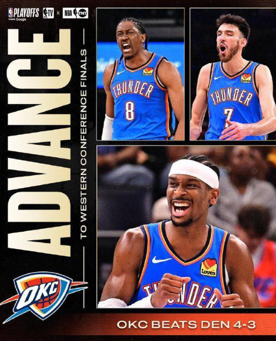 NBA季后赛继续进行,俄克拉荷马城雷霆队主场反弹追平总比分。亚历山大得到34分和8次助攻,威廉姆斯得到17分,他们率队前三节就确立大比分优势,雷霆队在西部半决赛第二战主场以149-106大胜丹佛掘金队。雷霆队把总比分扳为1平,双方系列赛的第三场将移师丹佛进行。